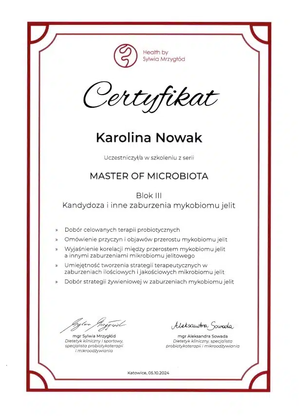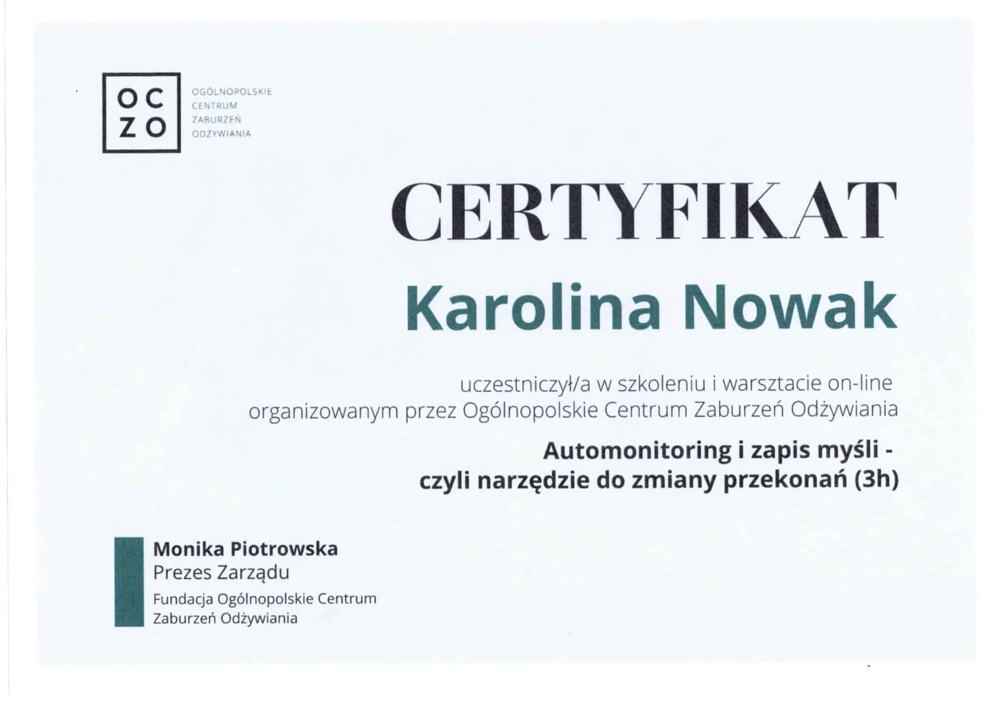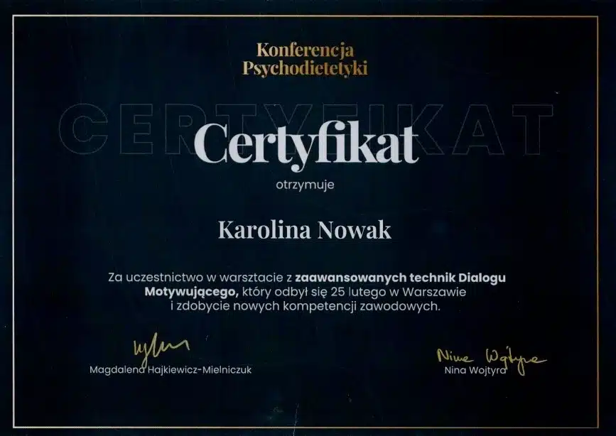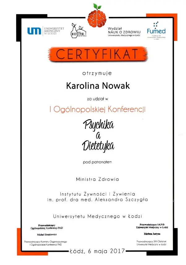 Swoją przygodę z dietetyką rozpoczęłam na Uniwersytecie Medycznym w Łodzi oraz SGGW w Warszawie. Jako studentka dietetyki nie mogę pochwalić się “fit” życiem, które wtedy wiodłam. Pomimo posiadania wiedzy na temat odżywiania nie umiałam ich wprowadzić w życie na stałe. Mogłam podzielić wtedy moje życie na okresy diety i treningów i zupełne niezwracanie uwagi na to, co jem i czy w ogóle mam jakąś aktywność fizyczną. Słowo “dieta” nie jest mi obce. Ze swojego doświadczenia wiem, że diety nie działają, dopóki nie zrozumiemy i nie zmienimy swojego dotychczasowego myślenia. Dlatego uważam, że nie ma dietetyki bez psychodietetyki.